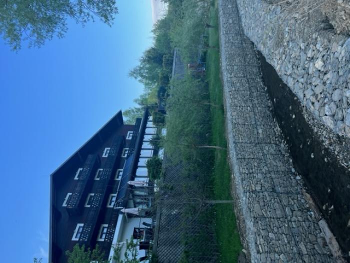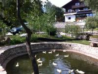 Gardul traditional, cu acoperis dranitit completeze peisajul, alaturi de aleile pavate cu lespezi din piatra de rau. Malurile paraului care strabate curtea si inconjoara locul de parcare, sunt aparate cu busteni de lemn, intr-o lucrare inginereasca pe care nu o veti mai intalni in alta parte. Rezultat al unui mestesug pierdut, lucrarea de "casite si podisti" a fost realizata de o echipa de proaspeti septuagenari din localitatea Malini, sub conducerea maistrului forestier "Tarzan".